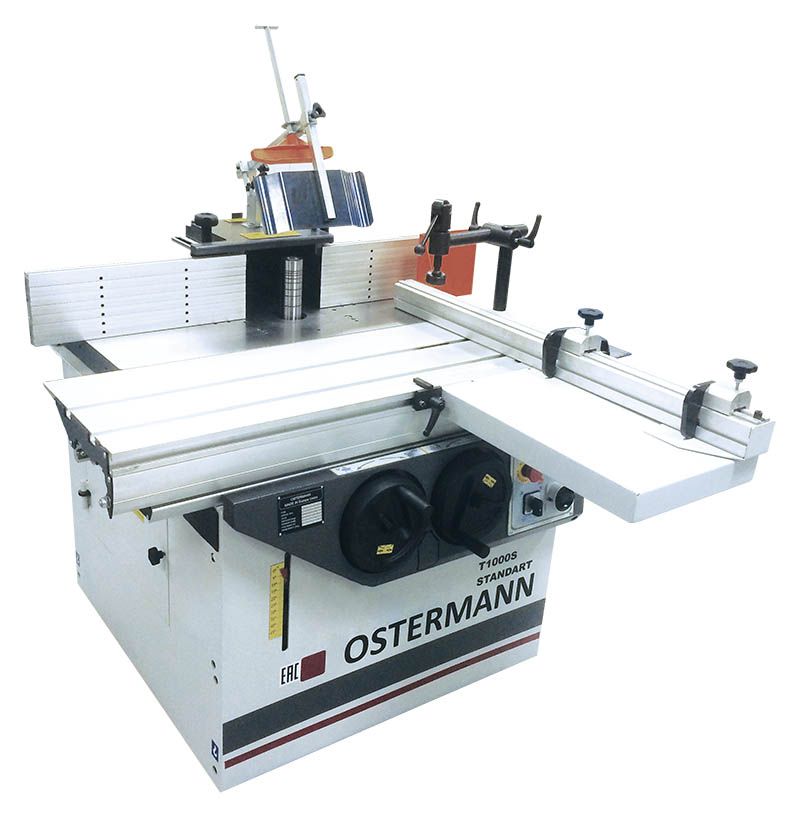 Фрезерные станки OSTERMANN имеют богатую комплектацию уже в базовом исполнении: наклоняемый шпиндель от 0 до 45°, высокоточная шипорезная каретка, телескопическая упорная линейка на каретке, интегральные направляющие и удобные шкалы для регулировок.