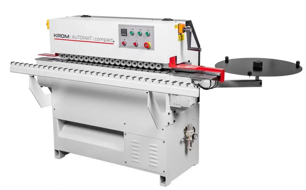 KROM AUTOMAT COMPACT — компактный автоматический кромкооблицовочный станок. Этот станок приклеивает кромку, предварительно обрубая её от бобины, фрезерует по длине (одновременно сверху и снизу) и полирует. В результате вы получаете деталь с приклеенной и обработанной кромкой, но для завершения процесса необходимо вручную или с помощью TRIMM90 обрезать выступающие концы кромки.