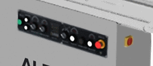 ПУЛЬТ УПРАВЛЕНИЯ Пульт управления станка позволяет оператору быстро включить/выключить привод пил, а также настроить вылет основной и подрезной пилы, которые регулируются при помощи электромоторов. На панели установлен индикатор частоты вращения основной пилы, а также кнопка аварийной остановки станка. |