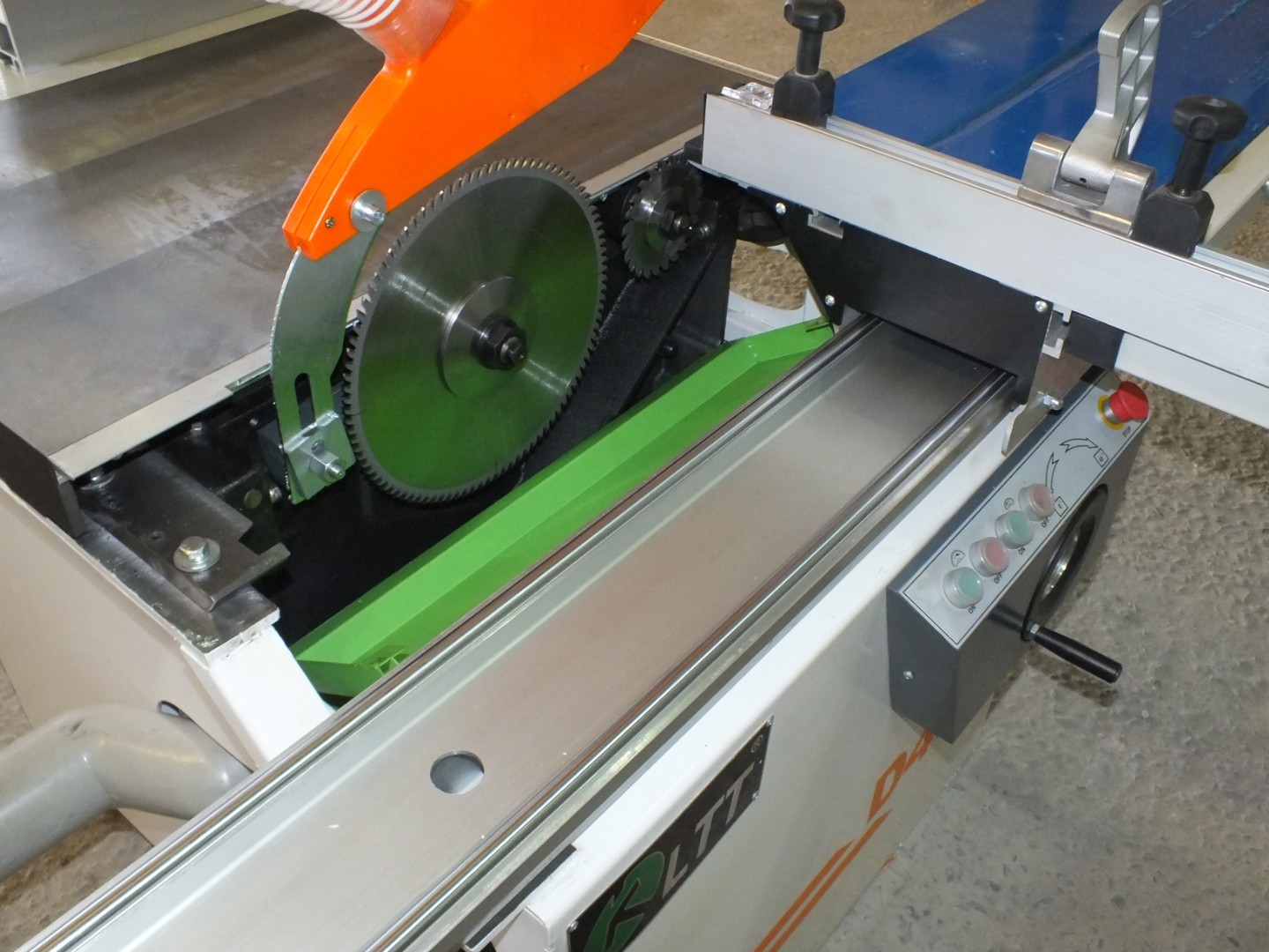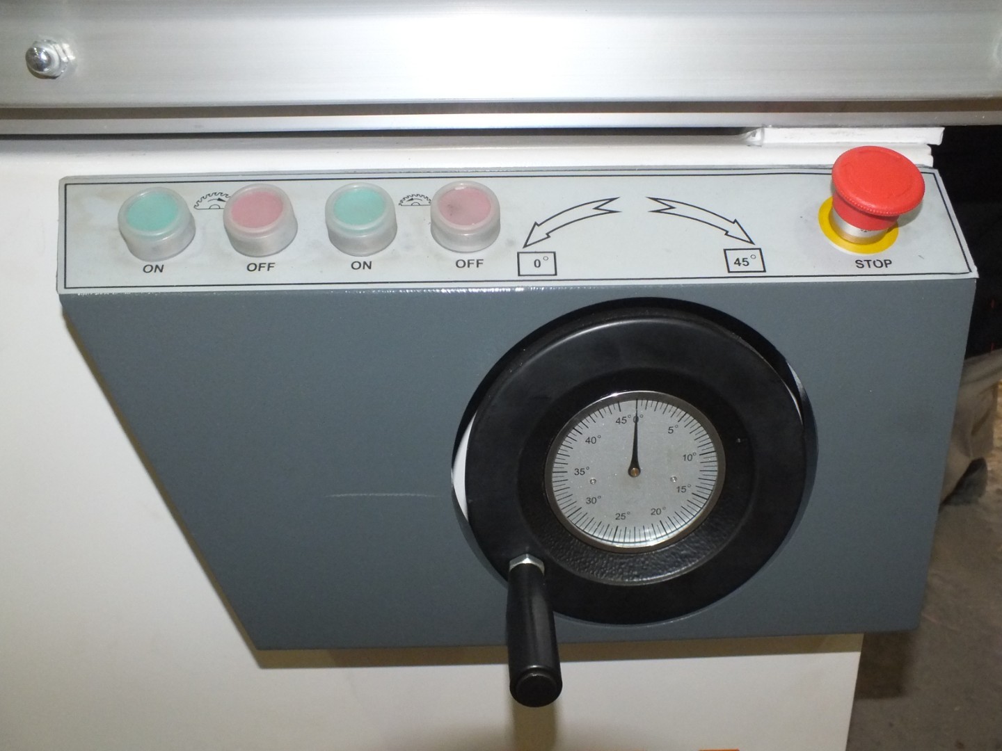 Для удобства работы оператора пульт расположен под углом. На панели расположены: электронный индикатор угла наклона пильного узла, кнопка экстренного отключения станка, кнопки запуска и остановки основной и подрезной пилы, электроподъём и опускание основной пилы. Настроить вылет основной пилы позволит электропривод и специальный тумблер. Наклон пильного узла 45 градусов осуществляется с помощью маховика, что позволяет быстро и удобно выставить нужный угол.