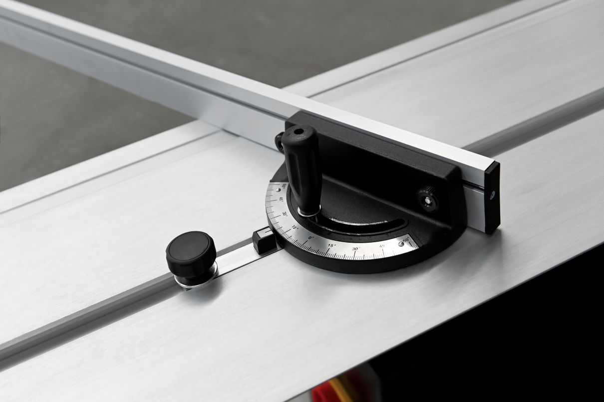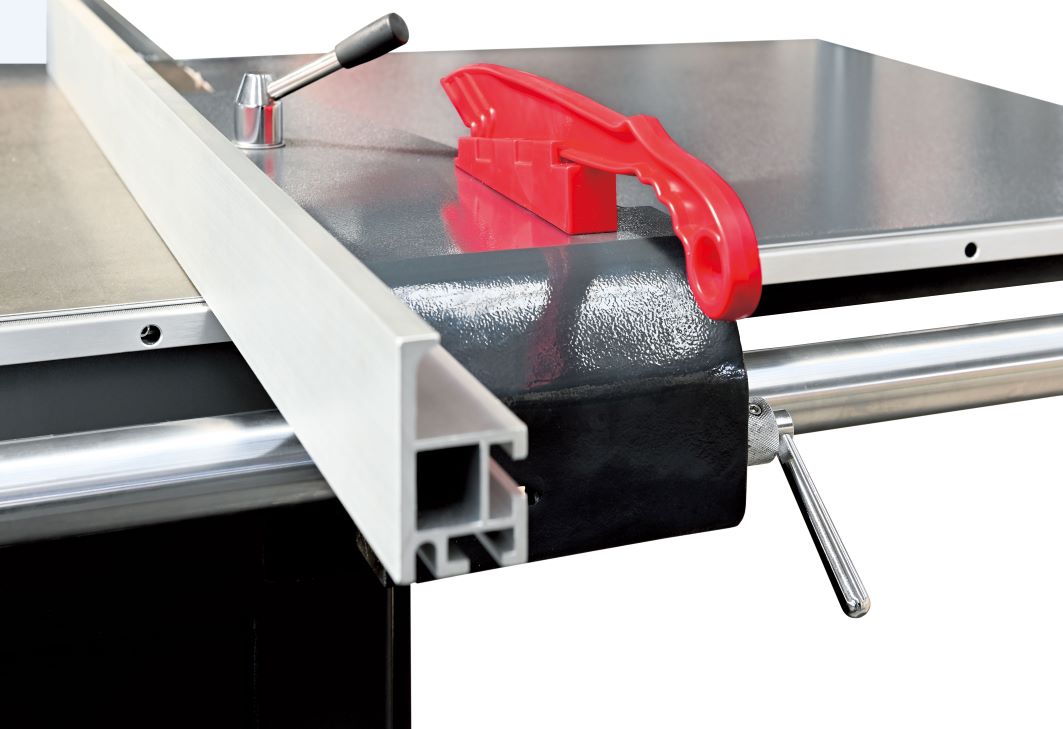 Правый параллельный упор имеет чугунное основание и подвижный алюминиевый профиль длиной 1200 мм, для осуществления параллельных резов упор перемещается по круглой 40 мм направляющей повышенной твердости. Для удобства настройки параллельный упор оснащен зажимом с точной регулировкой размеров. В комплекте идёт толкатель.