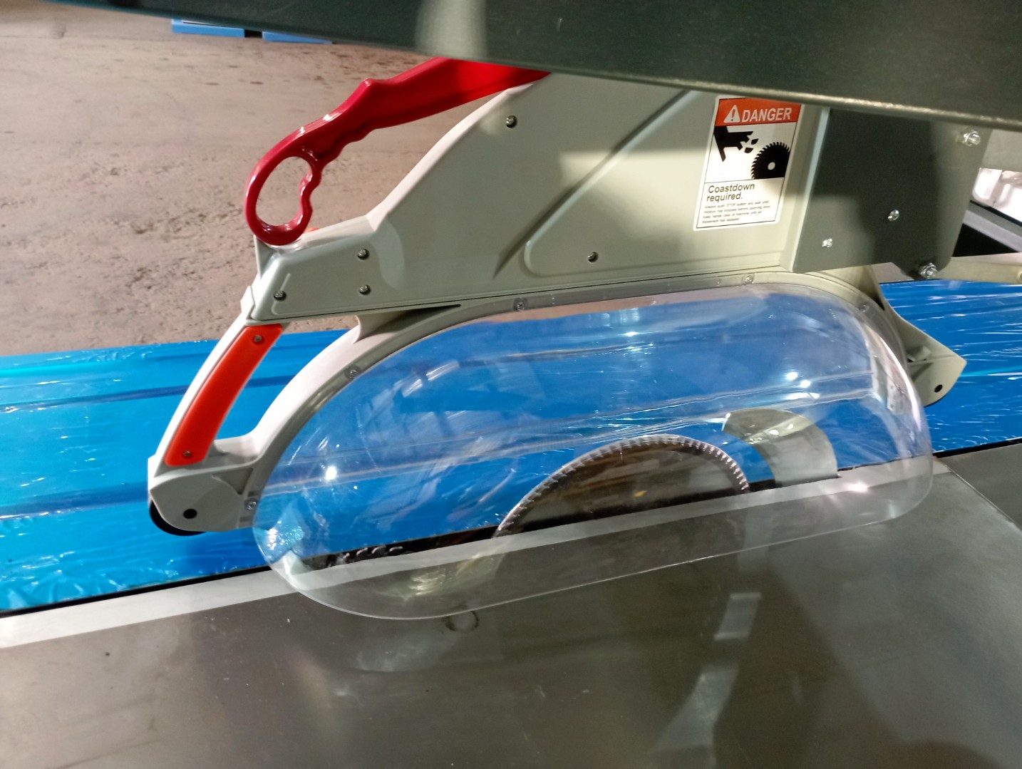 - Пластиковый прозрачный кожух защиты пилы с отводом для аспирации на поворотной штанге обеспечивает надежное удаление стружки из зоны обработки и чистоту рабочего стола. Съёмная прозрачная часть кожуха упрощает обслуживание станка.