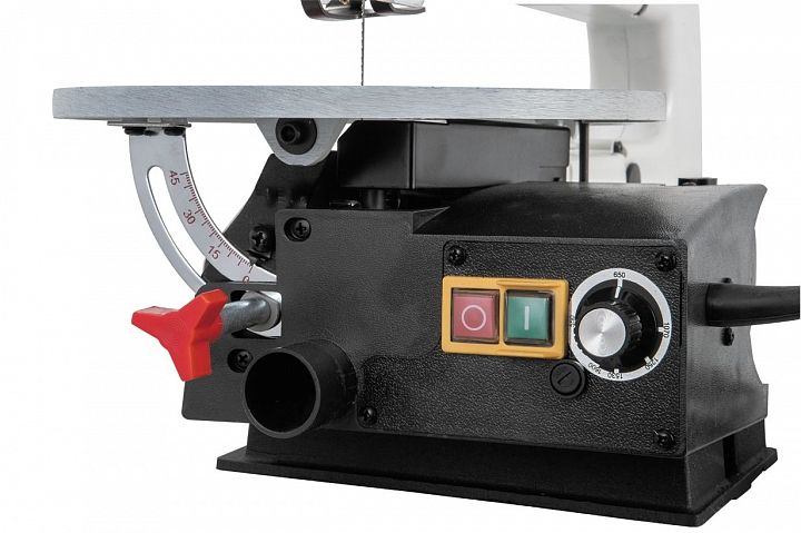 Для распиловки под углом к поверхности предусмотрен механизм наклона рабочего стола, оборудованный транспортирной шкалой и стопором с лицевой стороны. Для удаления опилок с линии реза есть регулируемый патрубок для сдува опилок и 35-миллиметровый штуцер подключения к системе пылеотсоса.