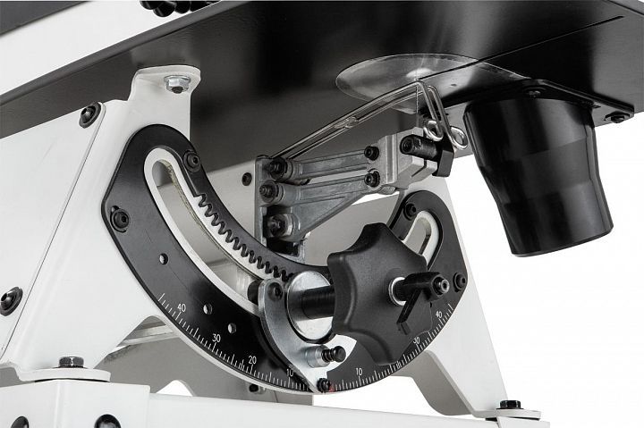 Рабочий стол изготовлен из толстого стального листа и жестко закреплен на основании, что обеспечивает точную работу без вибраций. Для выполнения распилов под углом к поверхности наклоняют «раму» с натянутым пильным полотном. Заготовка всегда остается в горизонтальной плоскости. Регулировка наклона производится зубчатым механизмом с приводом от вращающейся рукоятки. Он симметричен и обеспечивает поворот как влево, так и вправо.