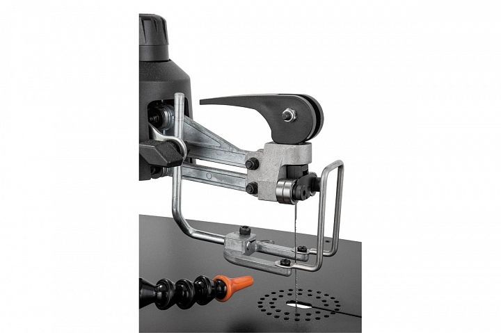 Станок работает с пильными полотнами без штифта. Верхняя часть пилки зажимается эксцентриковым механизмом, совмещенным с натяжителем, нижняя предварительно зажимается в адаптер, а после вставляется в вилку-оправку. В комплекте два таких адаптера, что позволяет иметь в быстром доступе полотна разных типов. Благодаря наличию прорези в рабочем столе существенно упрощается установка на стол заготовок с продетой пилкой.