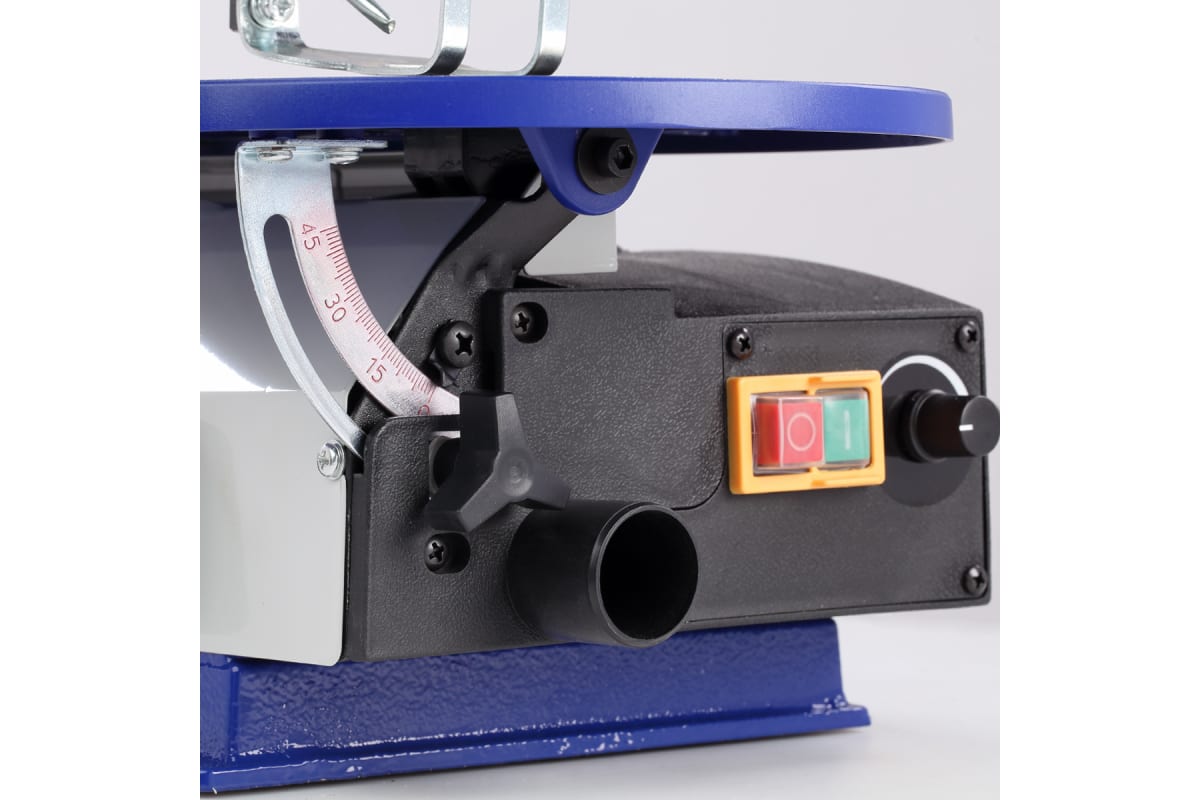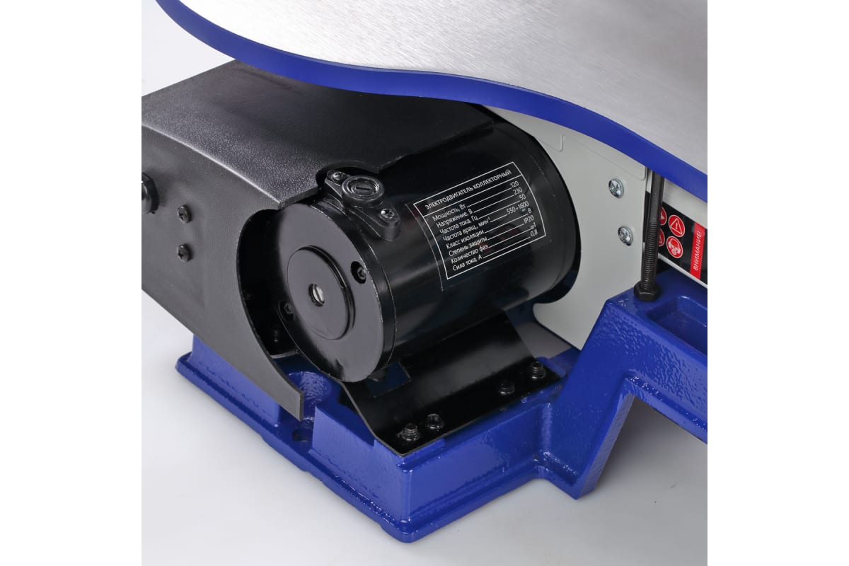 На чугунной станине установлен алюминиевый рабочий стол (253×412 мм), который имеет механизм угла наклона 0…+45 град.