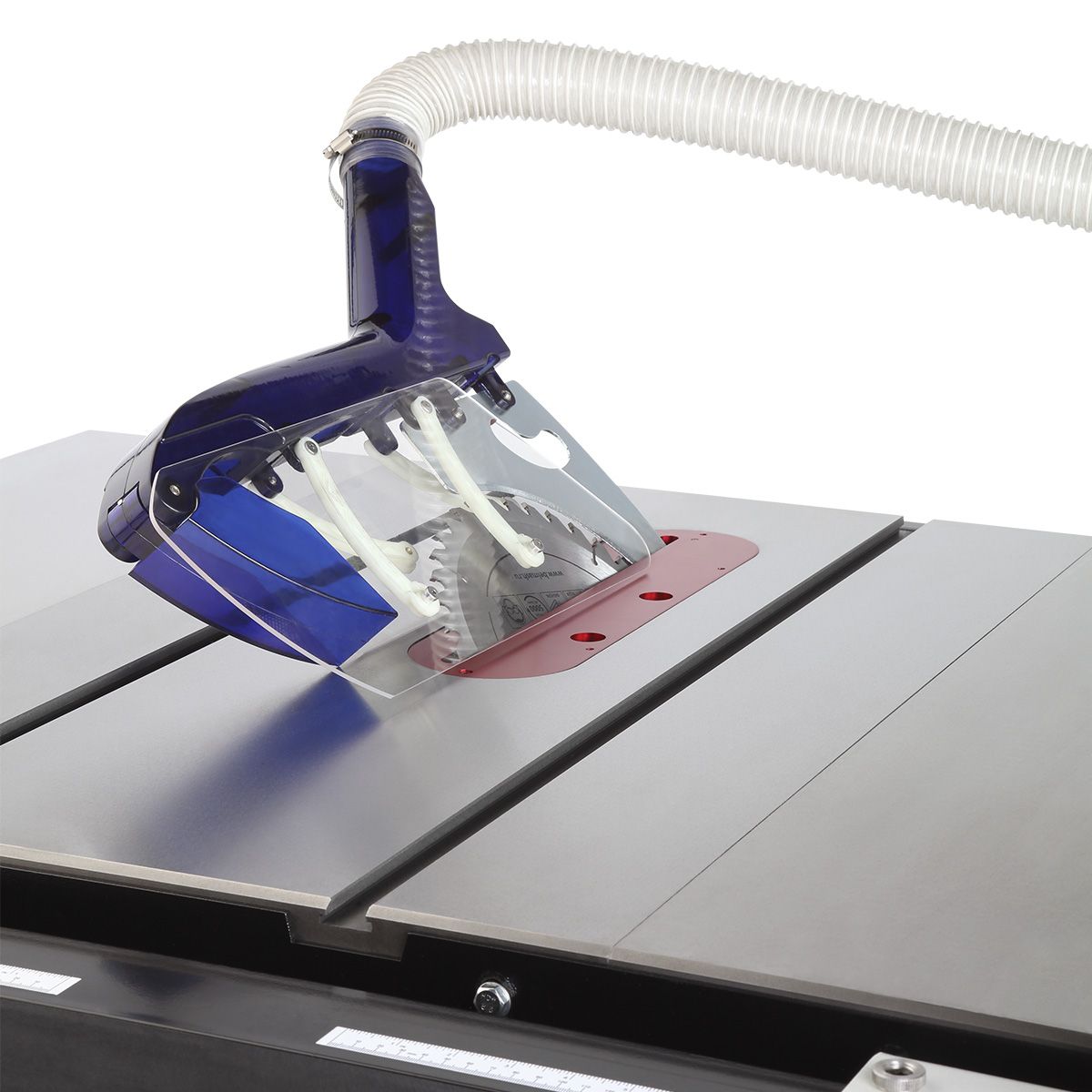 Кожух пильного диска устанавливается на расклинивающий нож и оснащен адаптером для подключения шланга пылеудаления диаметром 50 мм. Боковые панели кожуха выполнены по уникальной схеме: двухрычажные механизмы обеспечивают их плоскопараллельное движение. Это позволяет каждой панели независимо отклоняться при обработке заготовок разной высоты, сохраняя защиту оператора от стружки и пыли.