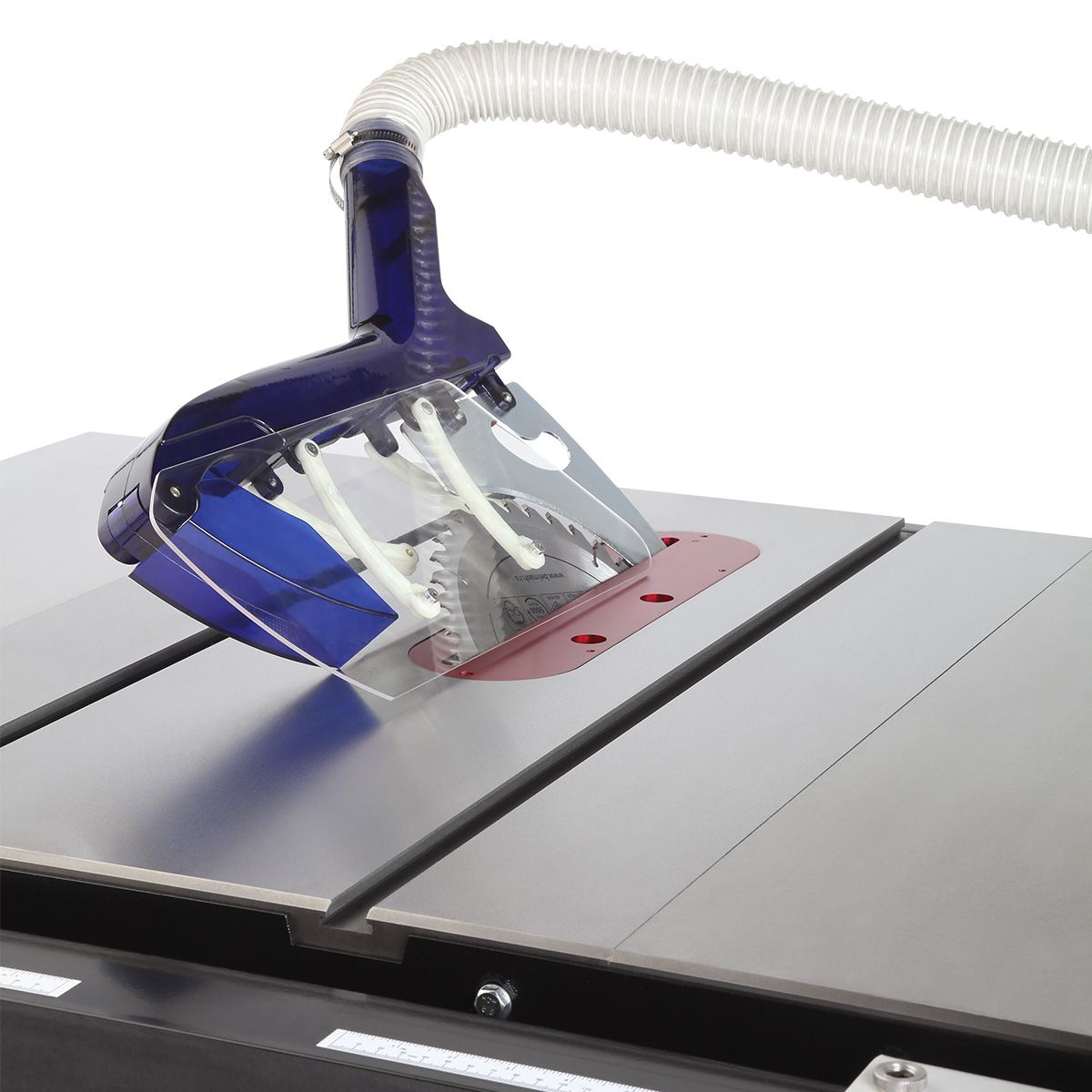 Кожух пильного диска устанавливается на расклинивающий нож и оснащен адаптером для подключения шланга пылеудаления диаметром 50 мм. Боковые панели кожуха выполнены по уникальной схеме: двухрычажные механизмы обеспечивают их плоскопараллельное движение. Это позволяет каждой панели независимо отклоняться при обработке заготовок разной высоты, сохраняя защиту оператора от стружки и пыли.
