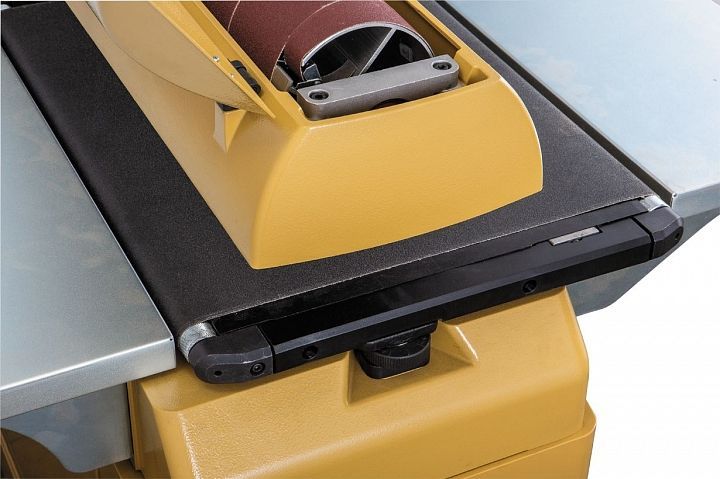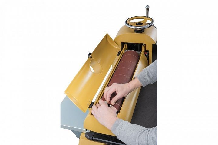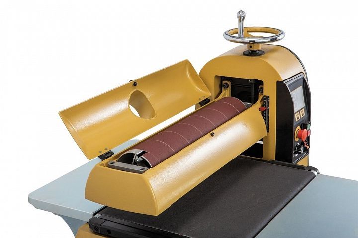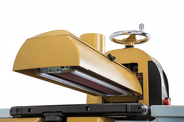 Для регулировки высоты положения шлифовального барабана предусмотрен массивный маховик с полированной поверхностью. Положение можно контролировать по привычной шкале на корпусе, но можно и по цифровому индикатору, так нагляднее и точнее. Он имеет переключатель режима отображения (дюймы/ миллиметры) и кнопку сброса для установки нулевого положения, что удобно как при смене толщины заготовок, так и при переходе к другой зернистости абразива. В качестве последнего используется лента шлифовальной бумаги, намотанная на алюминиевый барабан. Ее концы фиксируются в специальных зажимах, обеспечивающих простоту фиксации и автоматическое натяжение.