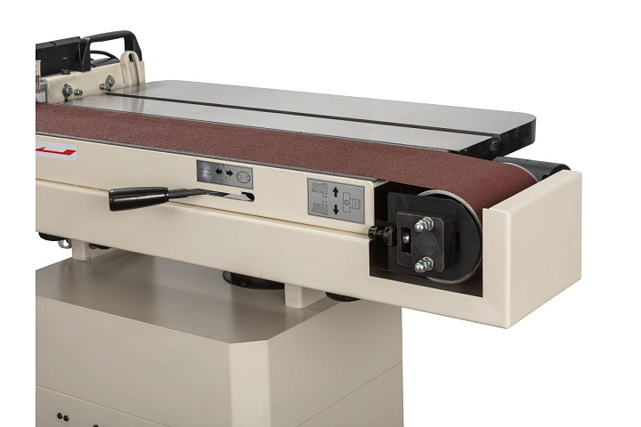 Шлифовальный узел станка выполнен поворотным вокруг продольной оси, его можно установить вертикально, горизонтально или под любым промежуточным углом, фиксация выбранного положения производится эксцентриковой рукояткой без использования инструмента. Основной рабочий стол, сделанный из литого чугуна, регулируется по высоте, что позволяет выровнять его поверхность с плоскостью ленты при её горизонтальном положении или использовать ресурс всей её ширины при эксплуатации в вертикальном. Для фиксации заготовки предусмотрены длинный «параллельный» упор с фиксацией в Т-образном пазу и подвижный угловой.