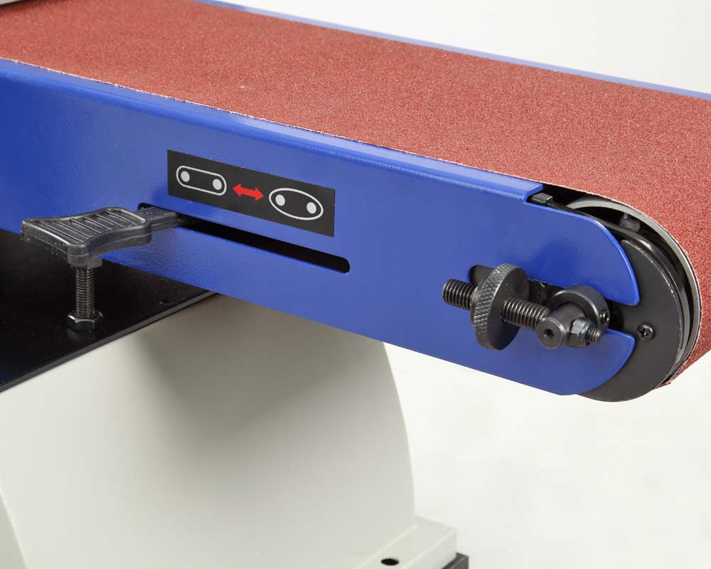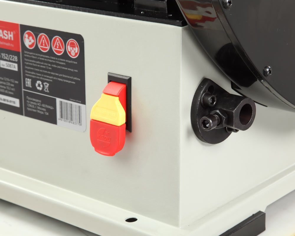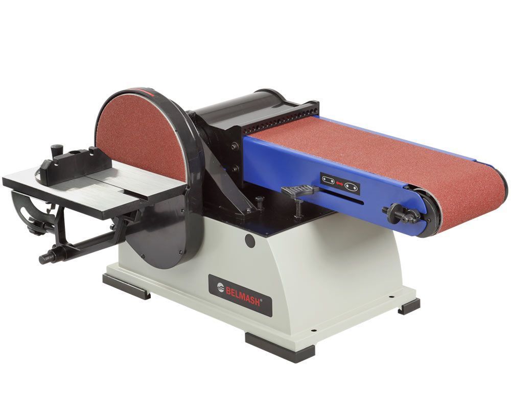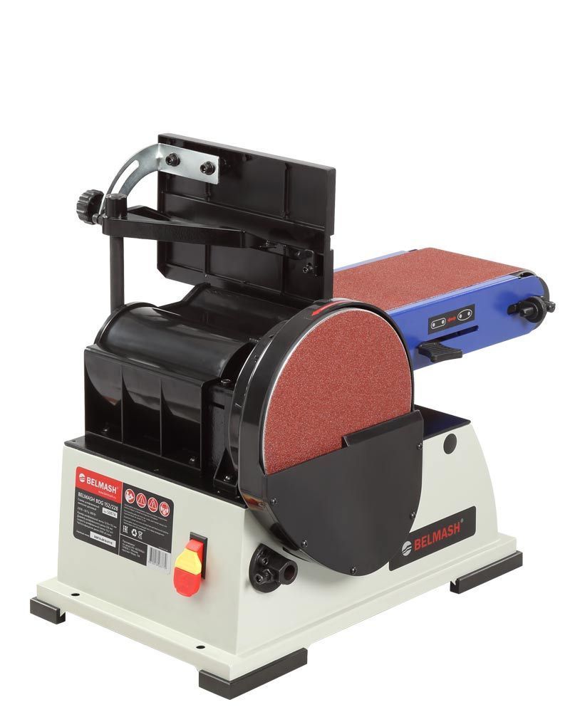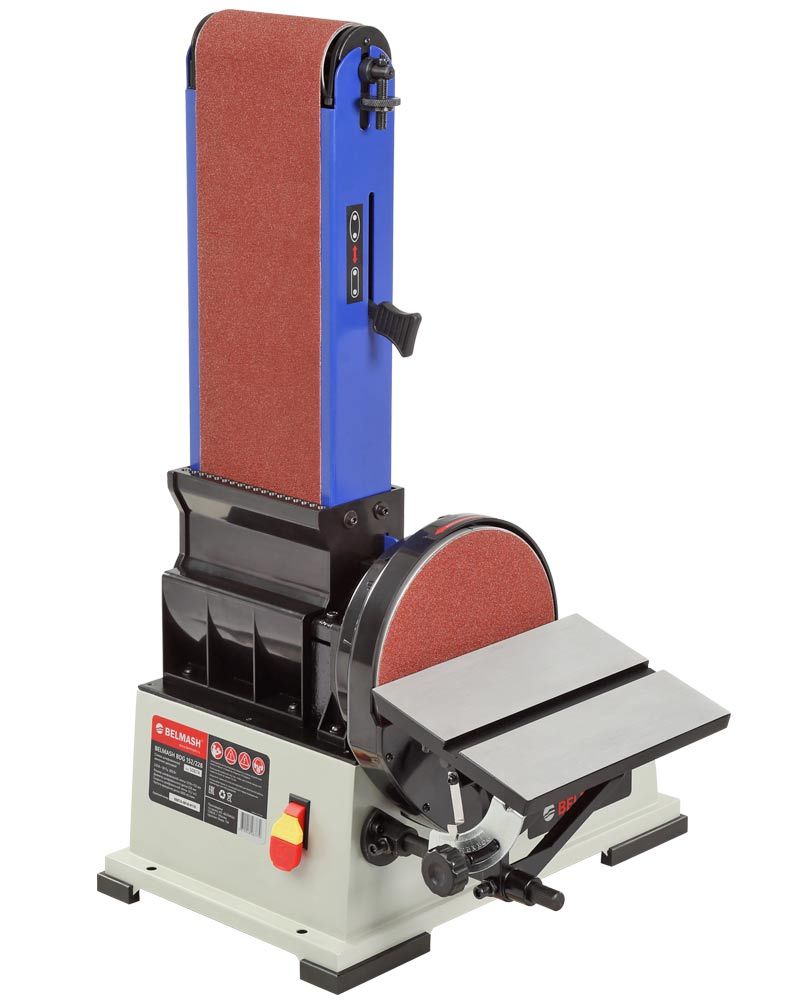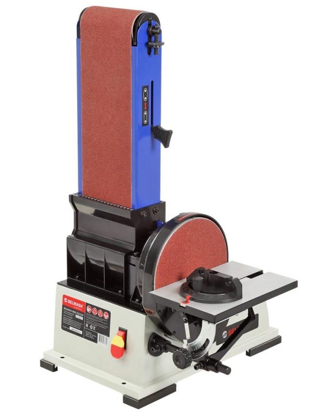 Абразивные материалы стандартные: лента – 1219×152 мм, диск – Ø228 мм. Станок надежно удерживается на верстаке за счет опор-виброгасителей, но для дополнительной безопасности его можно закрепить. Для этого на опорной платформе предусмотрены 4 отверстия.