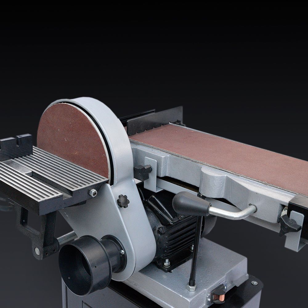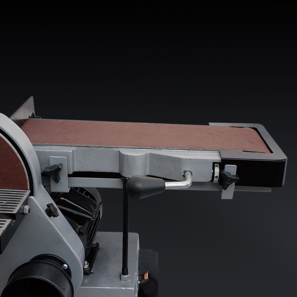 - Регулируемый ленточный узел работает вертикально, горизонтально или под любым промежуточным углом. При шлифовании по контуру ограждение ленты легко снимается.