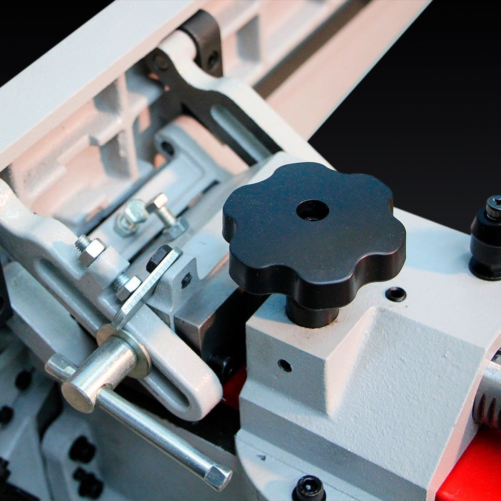 - Приемный столы просто регулируется маховиком с удобной фиксирующей рукояткой. Подающий стол регулируется быстродействующим рычагом.