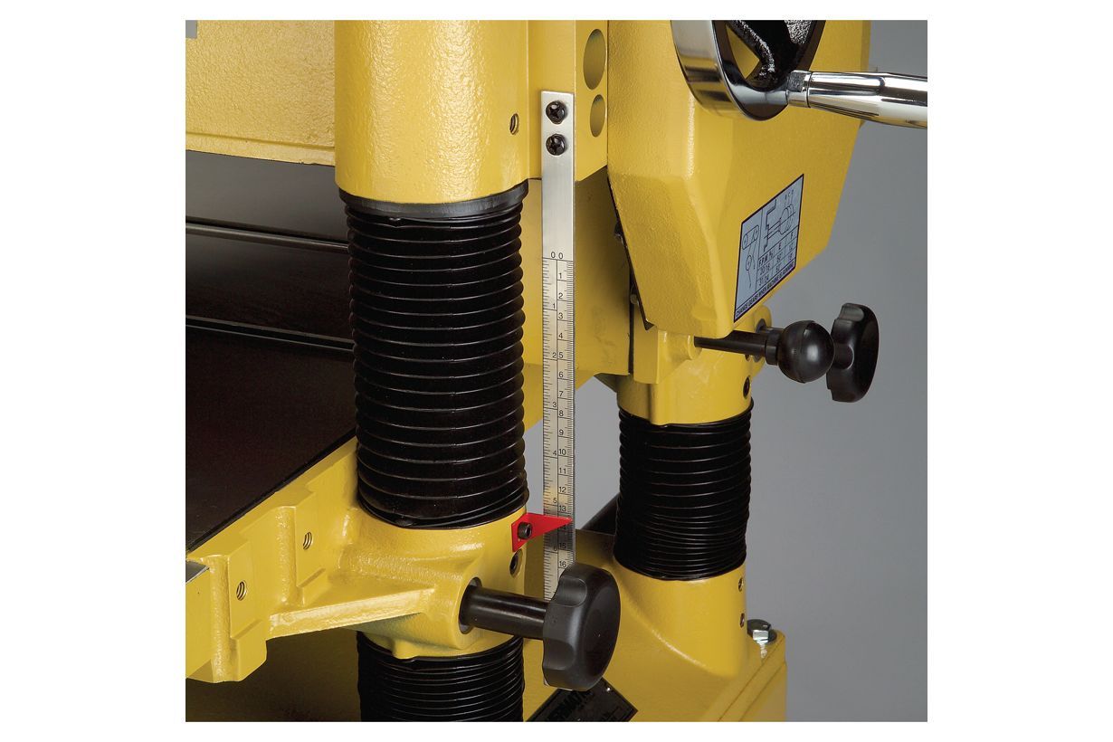 Станок имеет прочную, устойчивую к вибрациям, конструкцию на основе литых из чугуна деталей. Верхняя и нижняя части жестко связаны четырьмя цилиндрическими колоннами, по которым перемещается на направляющих рейсмусовый стол. В его центральной части установлены два регулируемых ролика для облегчения скольжения заготовки. Передняя и задняя секции тоже из чугуна, прикручены на болтах, имеют плоскую гладкую поверхность и роликами не оборудованы. Высота установки всего стола меняется вращением штурвала (маховика с рукояткой) и после настройки может быть дополнительно зафиксирована двумя стопорами со стяжными винтами.