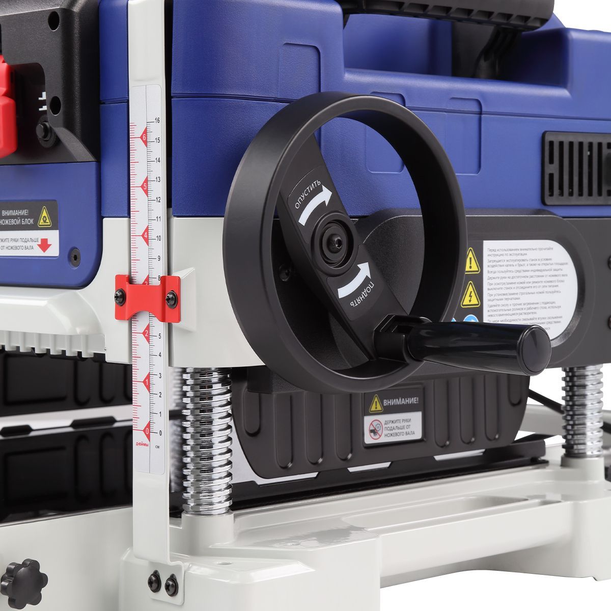 Регулировка высоты рабочей платформы осуществляется поворотом маховика с диапазоном от 5 до 152 мм. Для точной настройки предусмотрена шкала глубины строгания и ограничитель высоты с фиксацией на 5, 10, 18, 20, 25 и 30 мм. Это позволяет быстро устанавливать нужную толщину обработки и повторять параметры для серийных деталей.