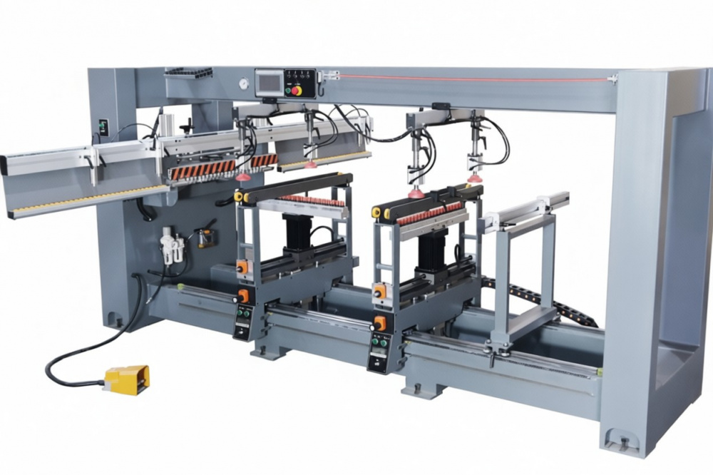 - горизонтальный сверлильный агрегат на 21 шпиндель с предустановкой под быстросменные патроны, с двигателем 1,5 кВт и цифровым индикатором рабочей высоты;