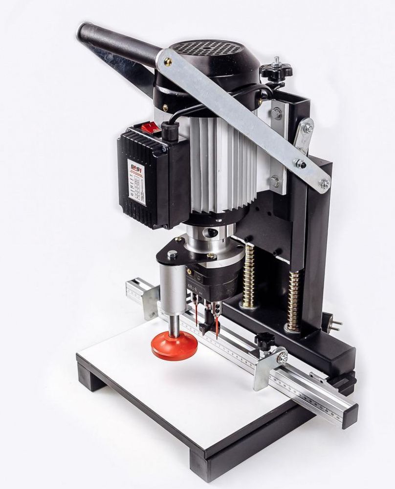 Сверлильно-присадочный станок настольного типа «SPS 1», в первую очередь, предназначен для рассверловки присадочных отверстий под мебельную петлю, однако его так же можно использовать и в работе под эксцентриковые стяжки (на пример: RAFIX или MINIFIX). Работает от сети в 220V. Компрессор для работы не нужен. В комплекте со станком поставляются сверла (под саму петлю и еще два под крепежные отверстия). Опускание работающего электродвигателя и сверл происходит механически, нажатием на ручку установленную в передней части станка. На станке имеется прижим, который обеспечивает фиксацию деталей в процессе работы. Из-за меленькой площади основы станка, при работе с большими фасадами или деталями рекомендуем изготовить расширительный столик или подставки слева и справа от станка.