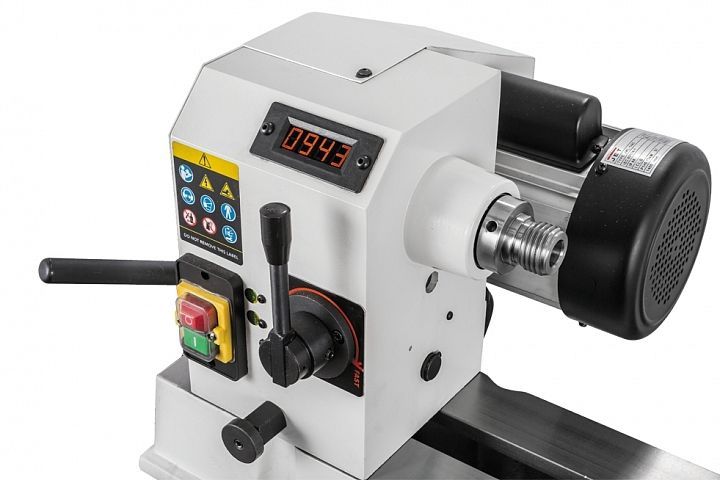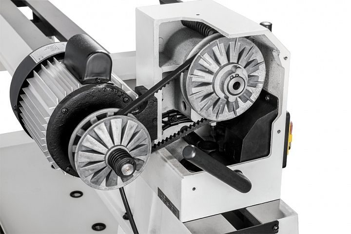 Размеры между центрами и над станиной достаточно велики, чтобы обрабатывать крупные заготовки. Таким задачам соответствует мощный асинхронный 750-ваттный двигатель, имеющий рёбра охлаждения и рассчитанный на продолжительную работу. Для передачи вращения использован клиноременный вариатор, имеющий 10 фиксированных скоростей для удобства переключения. Меняют их, не выключая мотор.
