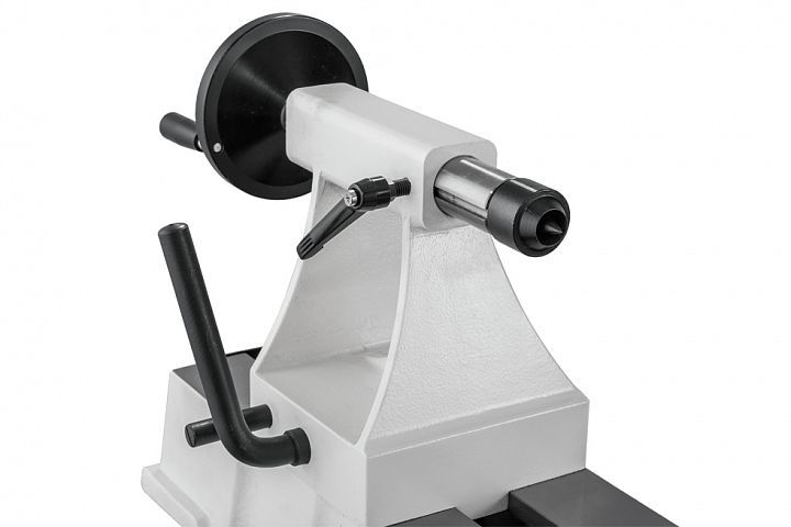 Полезная особенность станков — возможность поворота передней бабки вокруг вертикальной оси. Благодаря чему можно закреплять на планшайбе (входит в комплект) и обтачивать заготовки диаметром больше, чем размер над станиной. При этом ключевое значение приобретает конструкция подручника. Он имеет три степени свободы и собран из массивных литых деталей; все это позволяет пользоваться опорой и при точении сбоку станины. В некоторых случаях пригодится и возможность передвинуть переднюю бабку вдоль станины.