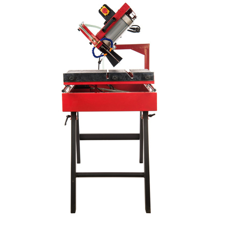 Станок базируется на прочной, цельной раме с внутренними каналами для отвода воды, которая обеспечивает высокую устойчивость и защиту от повреждений. Широкий стол отлично подходит для резки больших плит, наличие торцевого и передвижного боковых упоров способствует точной фиксации заготовки. Глубина резки при необходимости регулируется с помощью поднятия-опускания режущей головки. Резка осуществляется за счет перемещения каретки по направляющим. Возможно использование алмазных дисков диаметром от 350 до 400 мм с посадочным отверстием 25,4 мм. Электрический двигатель с защитой от перегрева.