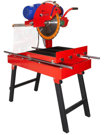 Эта модель отличается надежностью, устойчивой конструкцией, небольшим весом для своих характеристик. Благодаря складывающимся ножкам удобен при транспортировке, сборке. Глубина резки при необходимости регулируется с помощью поднятия-опускания режущей головки. Резка осуществляется за счет перемещения каретки по направляющим. Электрический двигатель мощностью 2,2 кВт снабжен защитой от перегрева. Привод на диск осуществляется с помощью ременной передачи (2 ремня). Станок укомплектован помпой для рециркуляции воды.