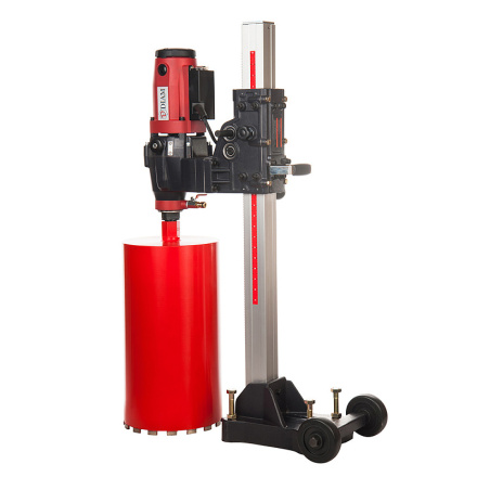 Установка алмазного бурения DIAM CSN-355N - профессиональная двухскоростная алмазная сверлильная установка со стальной стойкой в комплекте. Применяется для сверления отверстий алмазными коронками в бетоне, железобетоне, камне и кирпиче. Диаметр сверления от 25 до 355 мм. Мощность электромотора 2,7 кВт, напряжение 220 В. Сверлильная стойка без наклона. Вал имеет стандартный хвостовик для крепления алмазной коронки 1 ¼”. Оснащена системой подачи воды, защитой от перегрузки и перегрева, электрической защитой оператора от удара электротоком PRCD, двухскоростным редуктором для подбора оптимальной скорости сверления.