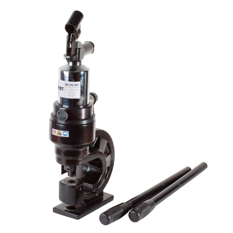 Автономный гидравлический пресс для пробивки отверстий в шинах КВТ ШД-95A представляет собой прочный механизм для обработки деталей из стали и меди толщиной 6 мм и 10 мм соответственно. Конструкция оборудования позволяет делать отверстия на удалении 70 мм от края шины (расчет до центра изготавливаемого отверстия). Особенностью пресса является возможность его стабильной работы в автономном режиме, а также от гидропомпы.
