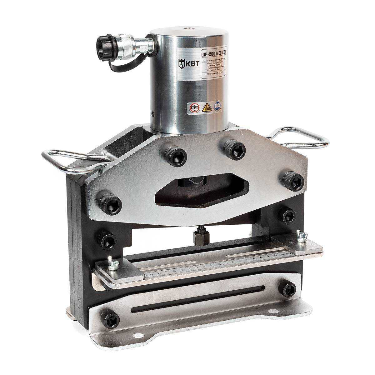 Гидравлический пресс для резки шин КВТ ШР-200 NEO используется в профессиональной сфере. Применяется для поперечной резки шин без замятий и заусенцев. Станок позволяет работать с шинами из стали, меди и алюминия. Конструкцией предусмотрена возможность крепления пресса к рабочему столу для дополнительного удобства эксплуатации.