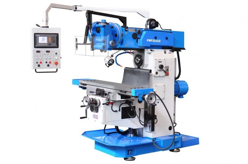Универсальный фрезерный станок «FWF32JU2» представляет собой новую модель станка из серии машин консольного типа. Станок, кроме обычного горизонтального шпинделя с конусом 7:24 ISO 40, оснащен наклонной вертикальной фрезерной головкой с конусом шпиндя 7:24 ISO 40, которая расположена в верхней части станка и приводится в движение отдельным двигателем. Вертикальная головка наклоняется в обе стороны ±45°, что дает возможность обрабатывать поверхности, которые не доступны обычным вертикальным фрезерным станкам.