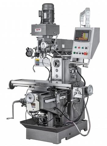 На станке JET JMD-1144GHV SPF DRO можно производить сверление отверстий до диаметра 30 мм и фрезеровать концевыми фрезами до диаметра 20 мм. На станке установлены вертикальный и горизонтальный шпиндели мощностью 2,2кВт. Скорость вращения вертикального шпинделя в диапазоне 90 – 2000 об/мин и горизонтального - 40- 1300 об/мин. Расстояния между вертикальным шпинделем и столом от 35 до 415 мм, между вертикальным шпинделем и колонной от 230 до 650 мм; горизонтальный шпиндель-стол – от 15 до 320мм. Выбор скоростей вертикального шпинделя осуществляется с помощью 8-ми ступенчатой коробки скоростей и имеет предустановленные скорости: 90, 160, 260, 390, 460, 690, 1130, 2000 об/мин.