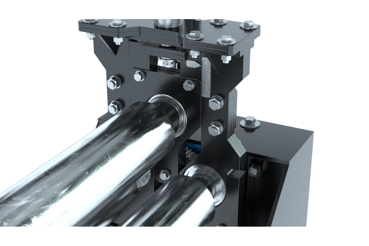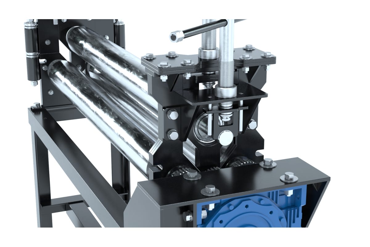 - Вращение приводных валов осуществляется с помощью мотор-редуктора, вертикальный ход верхнего валка обеспечен ручным перемещением винтов;
