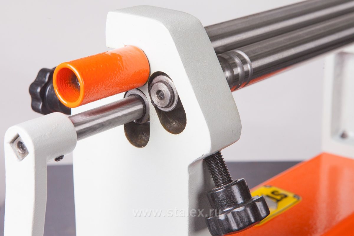 STALEX W01 не повредит обрабатываемый лист благодаря гладким полированным вальцам, имеющим отверстия для прутков. Снимать готовую деталь легко при помощи специального откидного механизма на верхнем вальце и быстросъемного зажима. Вращение вальцов осуществляется за счет зубчатой передачи. Нижний вал можно регулировать – на нем установлен кулачковый упор.