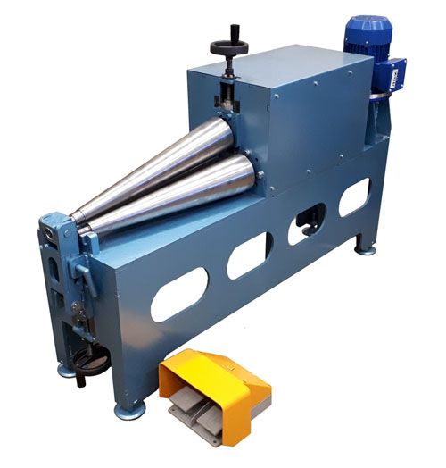 Для прокатки обечаек конусных деталей с малым (в диапазоне 30-100 мм) диаметром при вершине конуса мы разработали специальные вальцы с конусными валками.