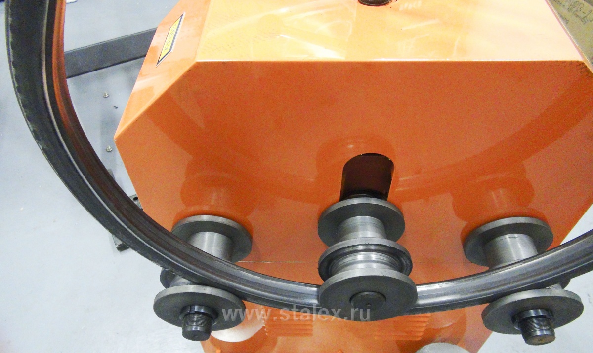 Тип станка – электромеханический, основное движение передаётся от электродвигателя расположенного в корпусе станка, через блок цепных передач, на два нижних приводных вала со сменными роликами. Что позволяет прокатывать/перемещать заготовку в обоих направлениях - благодаря такой конструкции многократно повышается производительность работы, а также даёт возможность монтажнику прикладывать меньше усилий по сравнению с ручными станками при гибки стальных труб, и затрачивать на гибку гораздо меньше времени. Второе движение – это движение механического продавливающего верхнего ролика, который постепенно деформирует заготовку в точке соприкосновения с заготовкой.