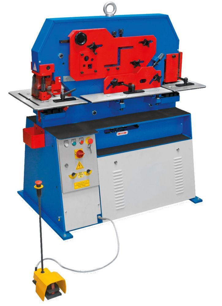 - DS-серия с двумя рабочими цилиндрами и двумя ножными педалями (совместная работа) со станцией перфорации и ножницами по профильной стали.