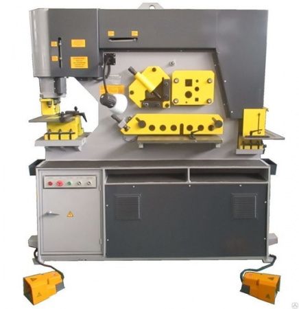 Исполнительными органами гидравлических пресс-ножниц являются двухходовые цилиндры. Шток цилиндра секции пробивки отверстий (пресса) закрепленного неподвижно на станине пресс-ножниц является рабочим органом, на торце штока через пуансонодержатель закреплен пуансон, являющийся рабочим инструментом. Цилиндр секции резки проката (ножниц), закрепленный шарнирно со станиной пресс-ножниц и ползуном, приводит в движение ползун (рабочий орган), на котором закреплен режущий инструмент. Управление цилиндрами производится при помощи гидроагрегата, расположенного в нижней части станины.