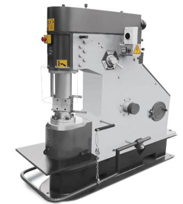 Заготовка в нагретом состоянии подвергается деформации под действием рабочего элемента – свободно падающего молота весом 40 кг. Удары молота серийные, скорость достигает 240 уд./мин. Доступны все операции – осадка заготовки, прошивка отверстий, рубка металла, протяжка и другие.
