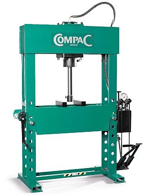 Напольный гидравлический пресс Compac FP50 с возможностью перемещения цилиндра. Насос с ножным и пневматическим приводом. Быстрое возвращение штока (необходима воздушная магистраль). Быстрое и безопасное перемещение стола пресса по высоте с использованием тормозного устройства. Ножной привод двухскоростной помпы обеспечивает быстрое перемещение штока в рабочую зону.