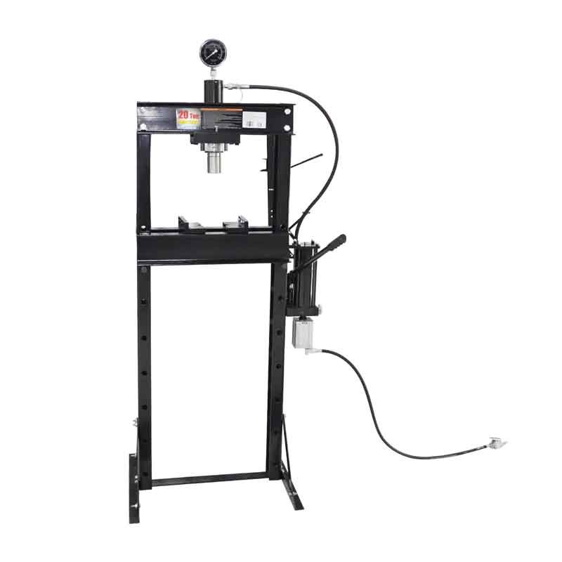 Гидравлический напольный пресс с манометром, оснащенный ручным гидравлическим приводом и дополнительным пневматическим насосом. Цилиндр с возможностью горизонтального перемещения. Качественный манометр с демпфирующей жидкостью.