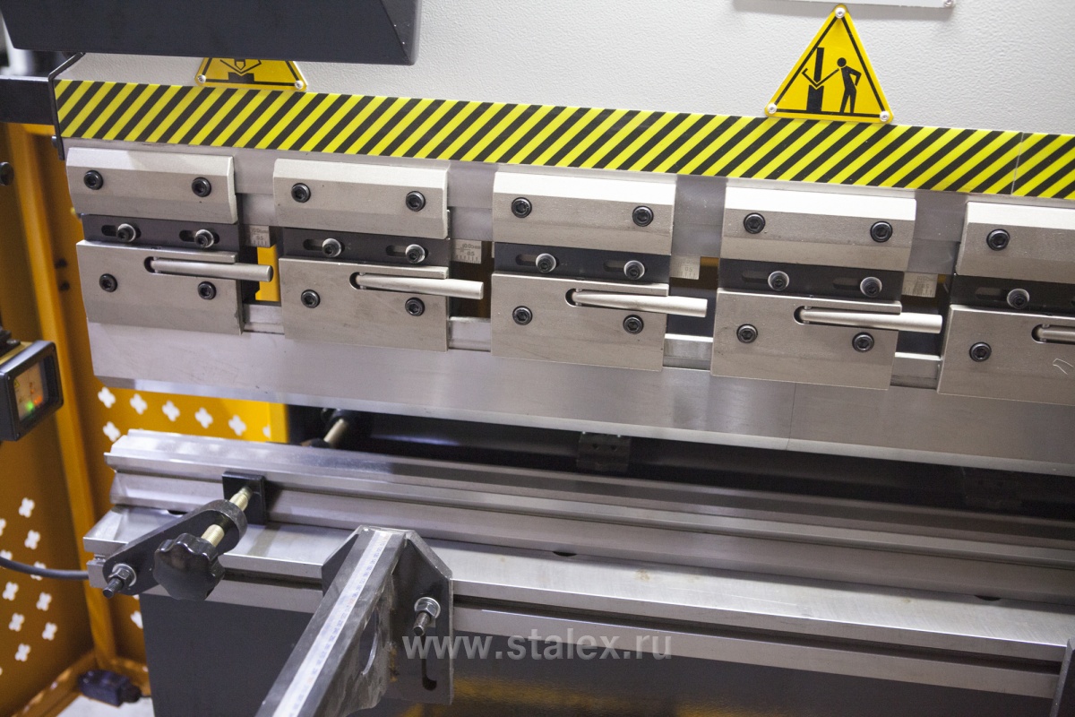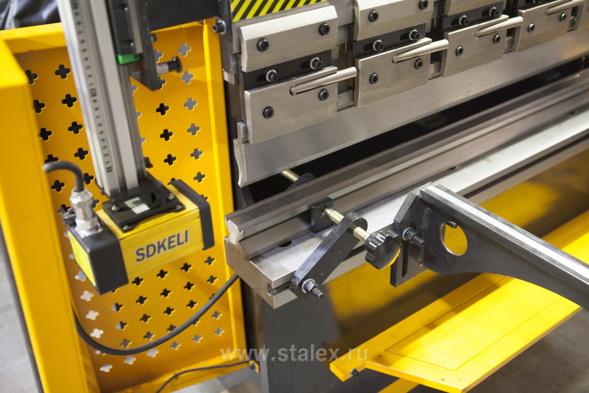 Регулировка по оси Y (ход траверсы) и X (ход заднего упора) осуществляется высокоточными двигателями от контроллера. Система позволяет отображать реальное положение осей станка и избавить оператора от вычислительных ошибок, возможность ввода значения математического ограничения движения механизмов (задних упоров и траверсы). Значения измеряемых координат отображаются на дисплее. Значение положения заднего упора гибочного станка поступает с датчика перемещения (энкодера), установленного на приводном винте ШВП. Положение траверсы гибочного станка отслеживается с помощью оптоэлектронных датчиков оптической линейки, установленной на станине станка (сигнал поступает на УЦИ преобразуясь в цифровое значение перемещения инструмента).
