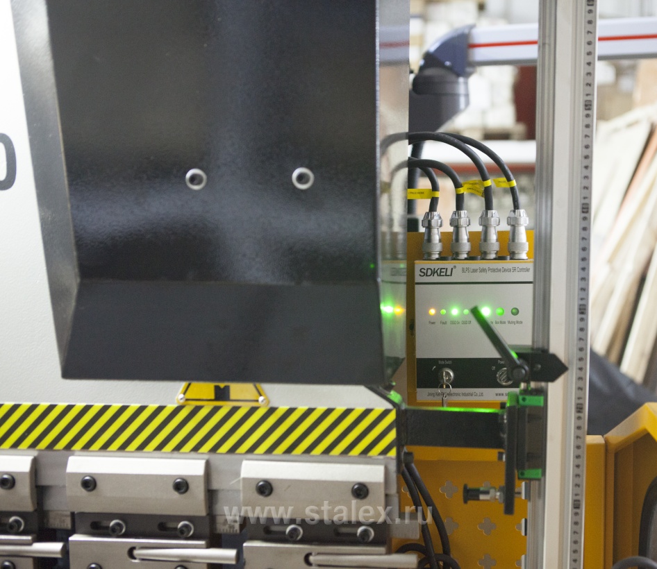 Станок оснащён - система управления Estun E21, алюминиевый рычаг с пультом управления, частотно-регулируемый привод, цифровое считывание по оси X/Y, предохранительный задний щиток и левый и правый боковые щитки, задний упор с силовым приводом с помощью шарико-винтовой передачи, основные электрические элементы Schneider, ножная педаль с аварийным остановом, верхний инструмент (пуансон) с функцией быстрого зажима, инвертор Schneider, передняя крышка со светодиодной лампой.