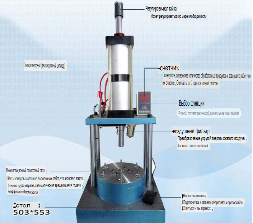 1. Многопозиционный роторный пневматический пресс, 6 станций, в 6 раз более высокая эффективность работы по сравнению с обычными станками, что обеспечивает чрезвычайно высокую производительность обработки.