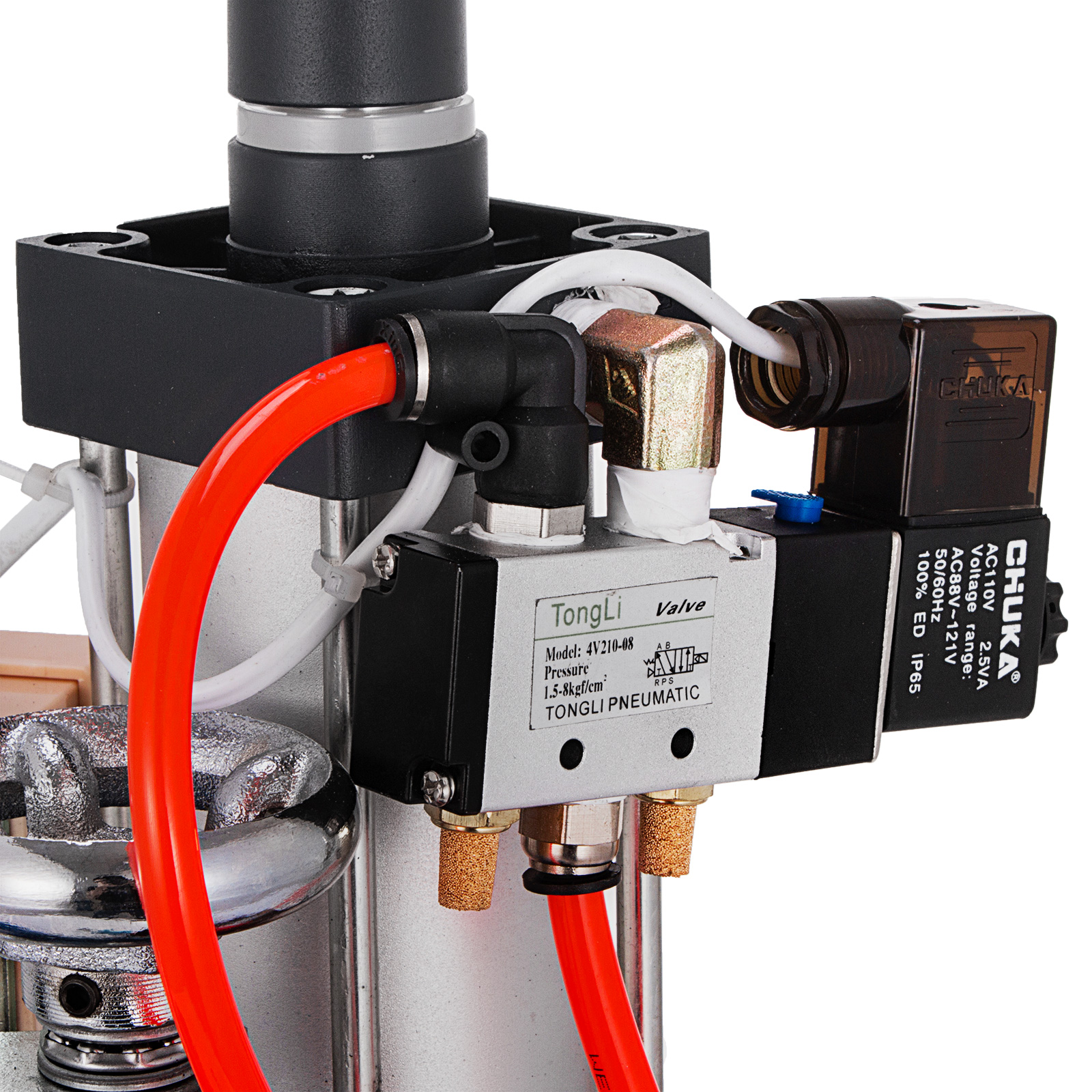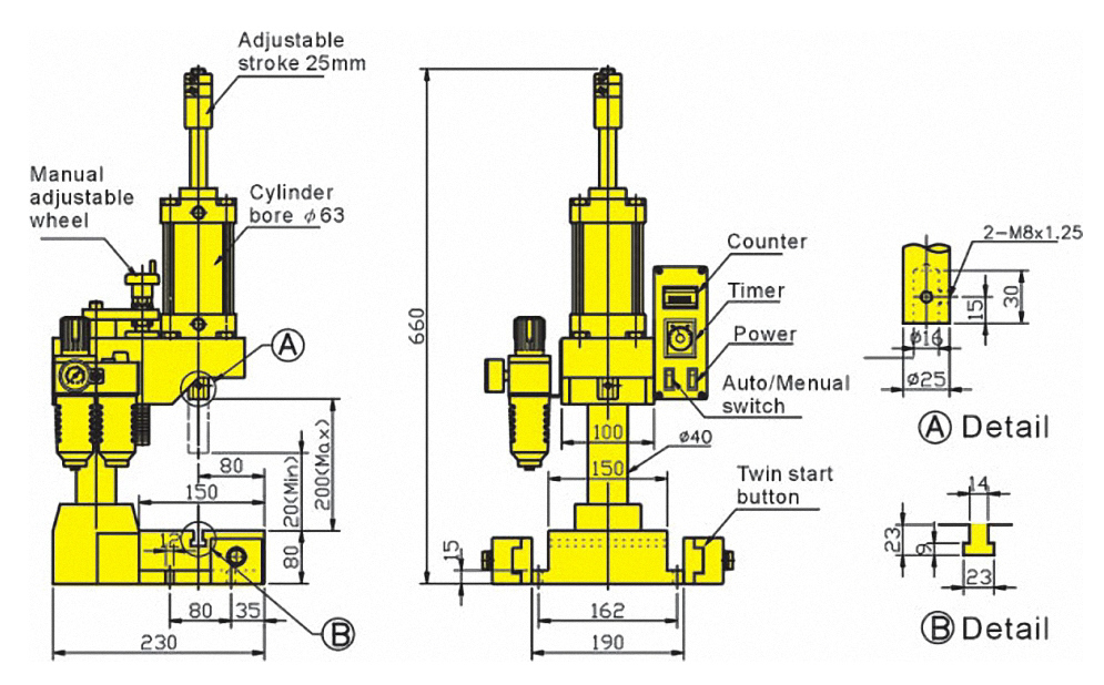 Пресс управляется двумя кнопками одновременно. Пневматический пуансон работает на сжатом воздухе, с низким уровнем шума, без загрязнения окружающей среды.