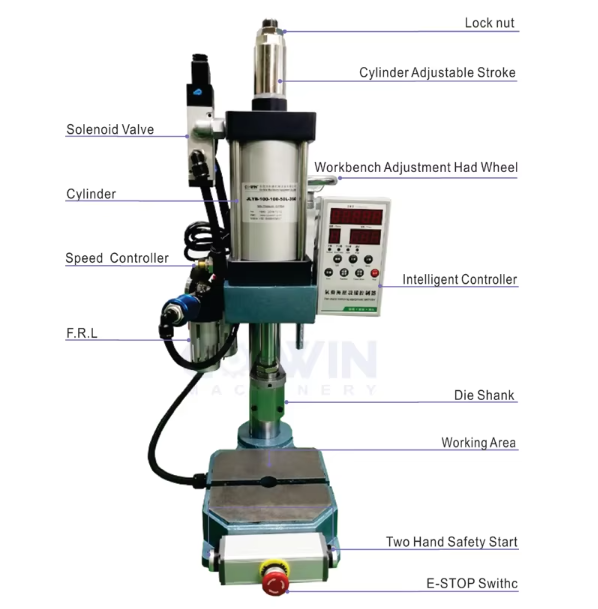 Этот пневмогидравлический пресс обеспечивает диапазон давления от 0,3 до 0,8 МПа и максимальную теоретическую производительность 15 кН. Он отличается простотой регулировки с помощью воздушного давления, высокой точностью и адаптивностью для точных ударных нагрузок. Машина поддерживает ручные, полуавтоматические и автоматические операции и включает системы безопасности, такие как кнопки двухкнопочного запуска и защиты от перегрузки.
