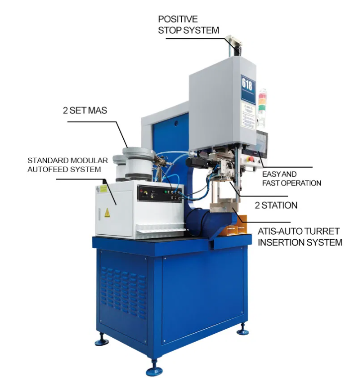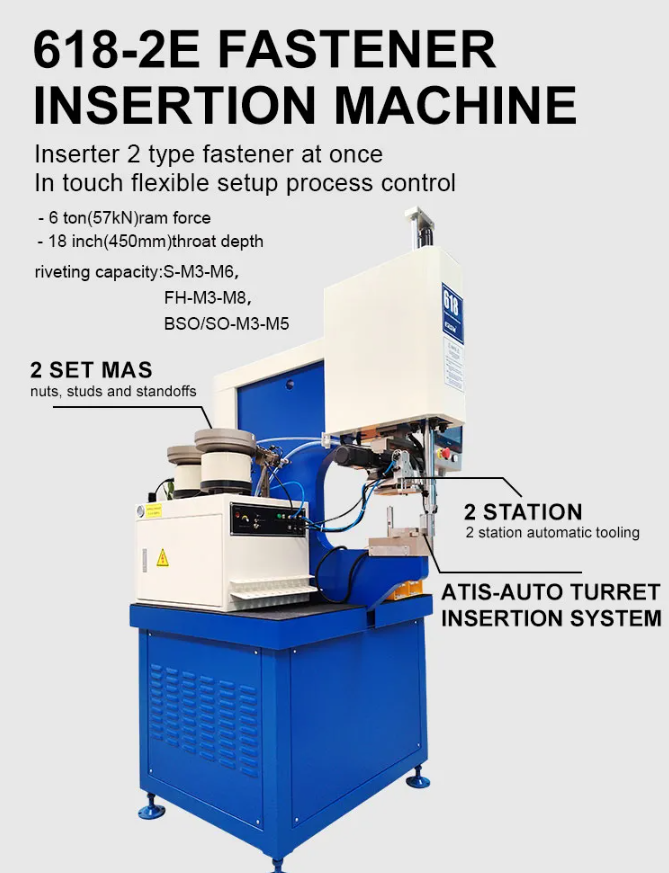 Машина для установки крепежа 618-2E — это полуавтоматическое решение, разработанное для повышения эффективности и точности процесса установки крепежа. Она оснащена двумя автоматическими станциями подачи, которые могут одновременно обрабатывать крепеж двух типов или размеров, устраняя необходимость ручной смены и сокращая время простоя. Система с револьверной головкой поддерживает до четырёх различных крепежей с автоматической регулировкой давления для бесперебойной работы. Интуитивно понятный интерфейс программирования позволяет точно контролировать перемещение станций, время выдержки и количество крепежа, а расширенные функции безопасности гарантируют безопасную работу. Эта машина идеально подходит для работы с различными материалами и значительно повышает производительность по сравнению с традиционными ручными методами.