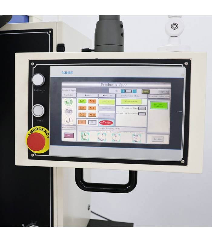 Пресс для запрессовки крепежа RSM 618 MSPe с автоматической подачей крепежа - мощный, надежный и понятный в эксплуатации. Оснащен системой защиты при касании мягких тканей, что защищает оператора от повреждений кистей рук при несоблюдении техники безопасности. На электронном табло Вы с легкостью сможете настроить нужное количество устанавливаемых метизов в изделие, вести подсчет установленных изделий за смену и за весь период эксплуатации. Данный станок оборудован сенсорным дисплеем, который позволяет легко и понятно настроить оборудование под нужные вам задачи.