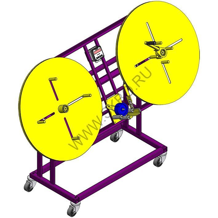 Конструктивно устройство представляет собой станок для перемотки мебельной кромки МПМК 0,8Н, смонтированный на подвижной или стационарной раме с вращающейся платформой.
