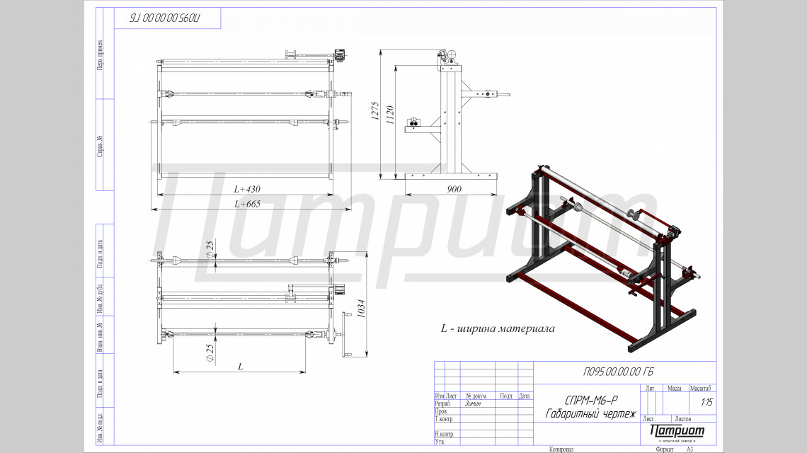 Все станки типа СПРМ-М6-Р выпускаются под заказ и рассчитываются по ширине перематываемого материала. Причем крайне не желательно заказывать станок с большим запасом по ширине перематываемого материала, т.к. это приведёт не только к удорожанию оборудования, но и к возможному прогибу подающей оси, что негативно скажется на качестве перемотки - материал будет наматываться криво и возможно появление складок.