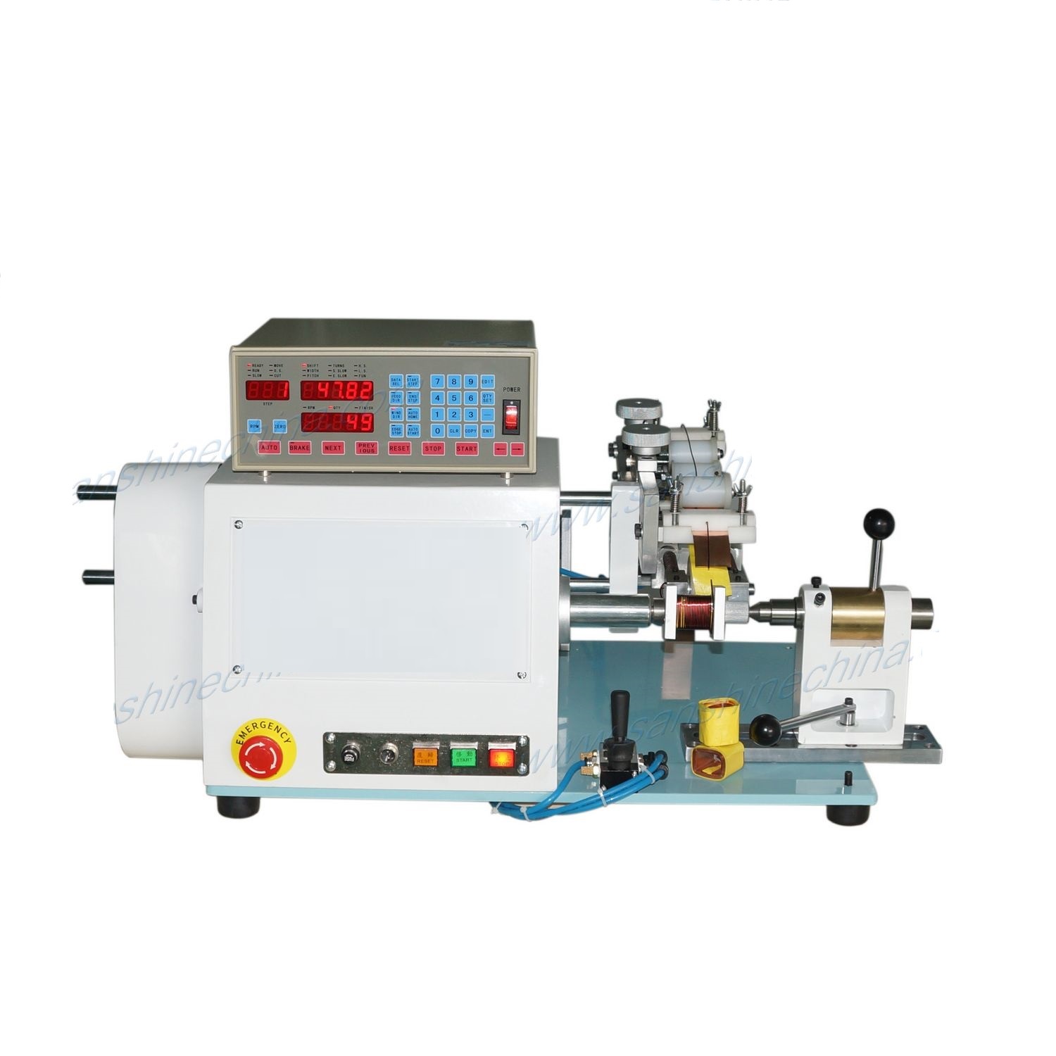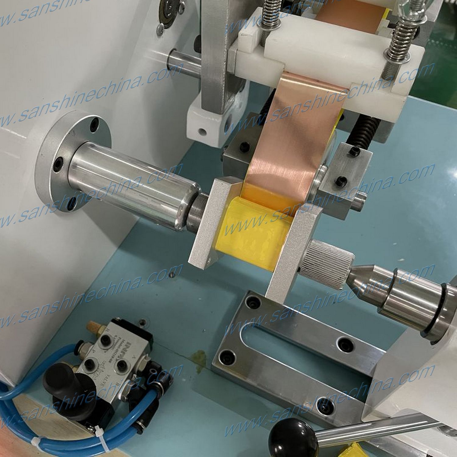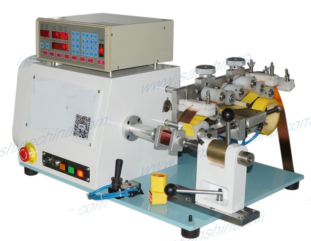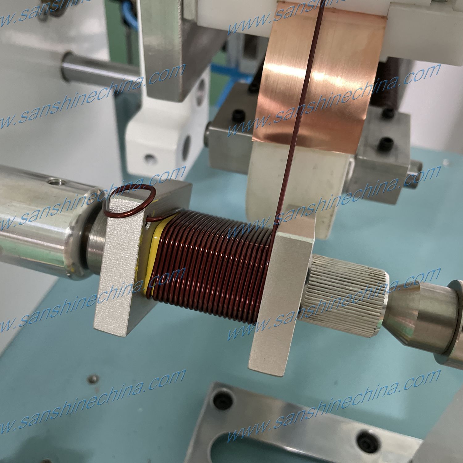 Программируемый автоматический станок для намотки катушек из медной фольги (SS851F) – это цифровой программируемый станок для намотки катушек из фольги с двигателем постоянного тока с высоким крутящим моментом. Этот станок используется для намотки индукторов и трансформаторов с фольгой. Он позволяет одновременно наматывать медную фольгу с изоляционной лентой из майлара (майларовой пленкой, изоляционной бумагой). Он также подходит для специальных трансформаторов, где одни обмотки намотаны круглым проводом, а другие – медной фольгой. Максимальный диаметр провода этого станка может достигать 5,0 мм для небольших катушек, если наружный диаметр готовой катушки менее 55 мм. Этот станок идеально подходит для намотки реактивных катушек, силовых трансформаторов, катушек из плоского провода, катушек из медной фольги, катушек из алюминиевой фольги, трансформаторов с медной фольгой и реакторов с медной фольгой. Также он называется станком для намотки медной фольги с слоем майлара. Этот станок может быть настроен в соответствии с размером катушки по запросу.