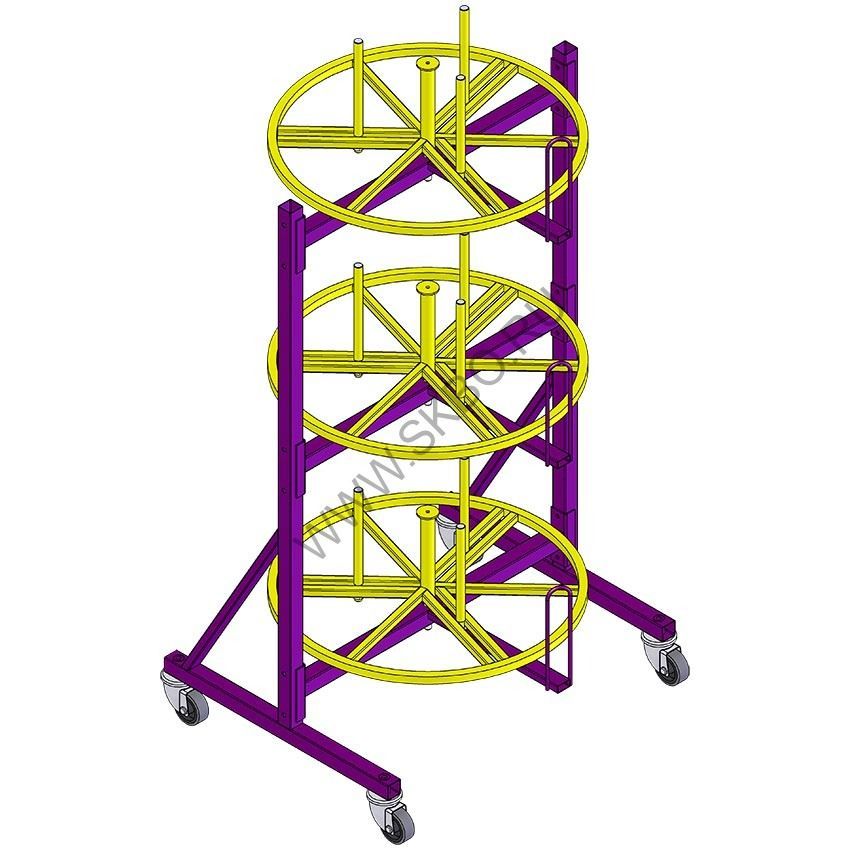 Конструкция стеллажа для кабеля СБ 3 К изготавливается разборной, что позволяет уменьшить затраты на доставку стеллажа. Также для обеспечения мобильности, стеллаж установлен на колесную опору.